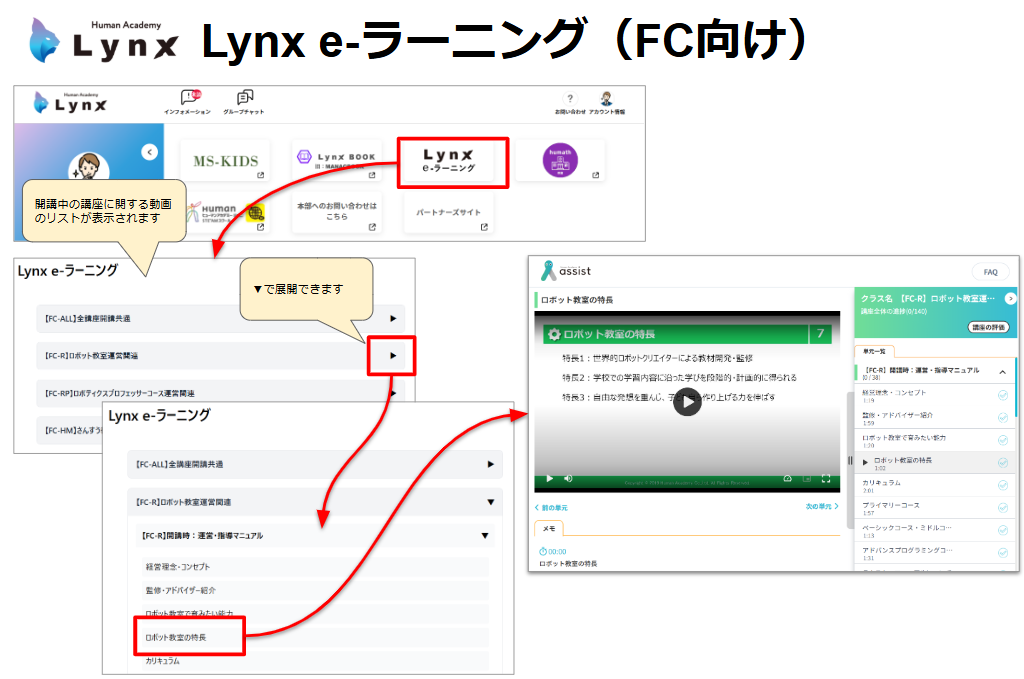 【Lynx】Lynx e-ラーニングの使い方について 2025年03月28日 11:32 更新 画面に表示されております 「Lynx e-ラーニング」をクリックすることで、画面遷移が行われます。 Lynx e-ラーニング画面にて、 閲覧したいコンテンツのリストを選択していくことで 動画コンテンツを閲覧することができます。 関連記事 【まとめ】2025教室用Lynxタブレットの運用方法について 【ロボット】タブレットの注意喚起の内容が知りたい 【Lynx】会員保護者アカウント登録のご案内方法について(資料添付) 【Lynx】LynxからMS-KIDSに自動ログインしようとすると、エラーになる。 【保護者Lynx】 Lynx内の「Lynx e-ラーニング」の動画閲覧について