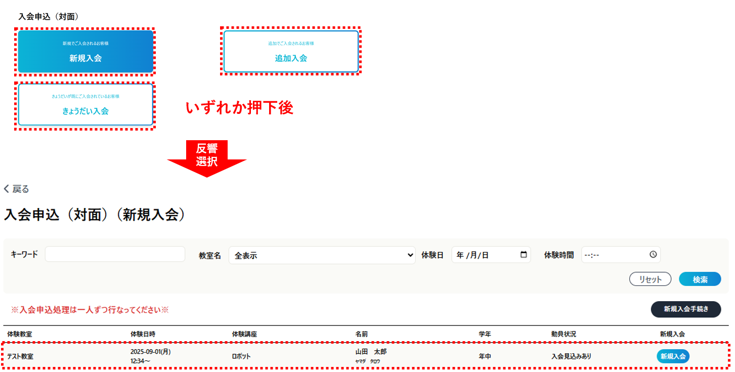 【Lynx】入会申込時、反響一覧にはどのようなデータが出てくるのか? 2025年09月05日 09:06 更新 反響選択画面には、ホームページより体験会申込を実施した反響情報が出力されます。MS-KIDSシステム内から「反響新規登録」機能を使用した反響データは、上記反響選択箇所には出てきませんので、ご注意ください。 関連 反響一覧 入会申込