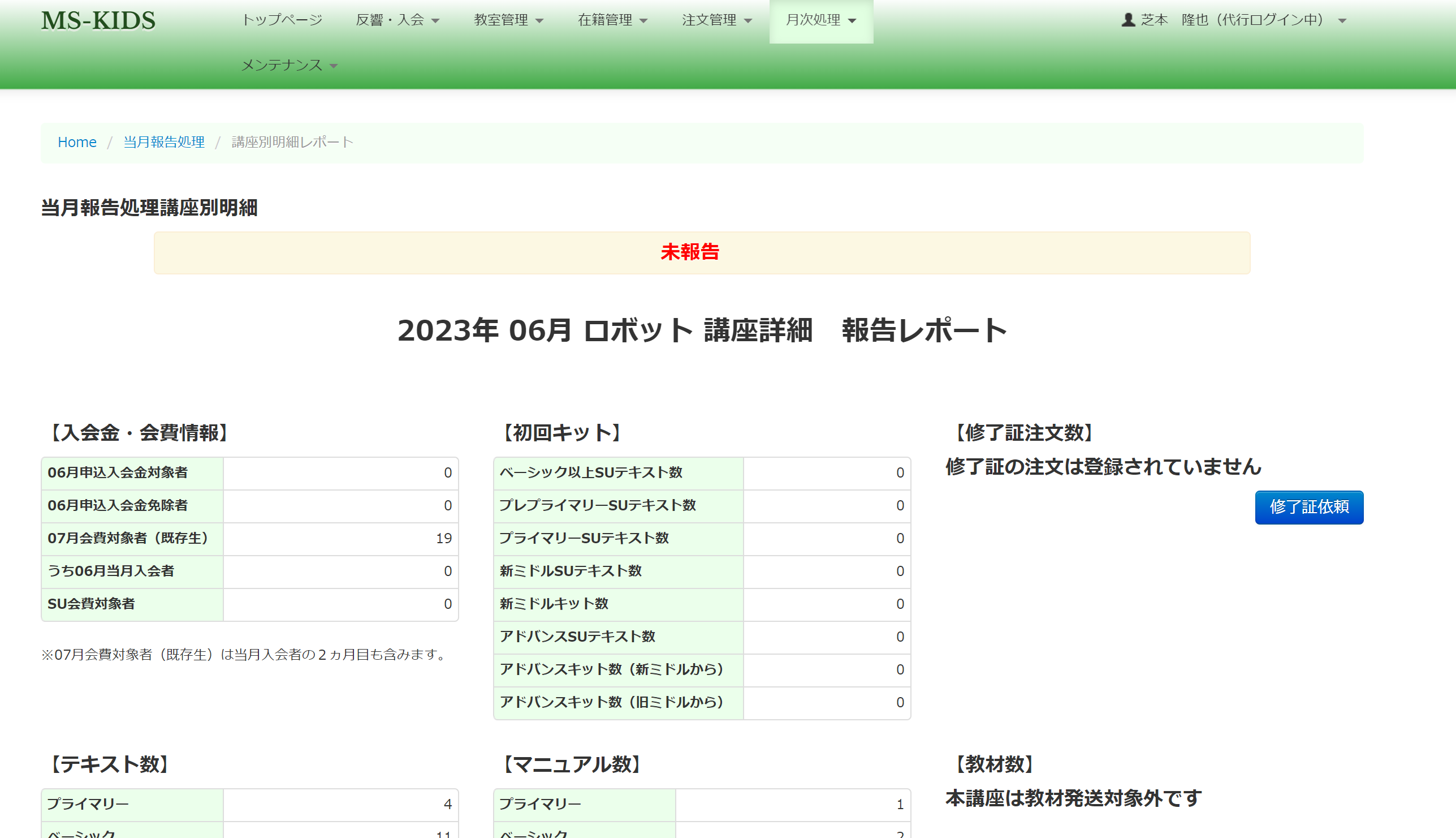 【MS-KIDS】修了証はどこから発注しますか? 2026年01月05日 03:46 更新 MS-KIDS>>「月次処理の画面」で修了証を登録できます。 ※無償です。※途中進級でも修了証をお出しします。 ▼月次処理の画面右、「修了証依頼」ボタンから選択。 関連 MS-KIDS 関連記事 タブレット(Android、iPad)からテキストを印刷ができない。 【LynxKids】振替授業のとき、「こんげつのきょうかしょ」に表示される教科書は何ですか? 【MS-KIDS】HP上の受講曜日・時間を修正するにはどのようにするか。